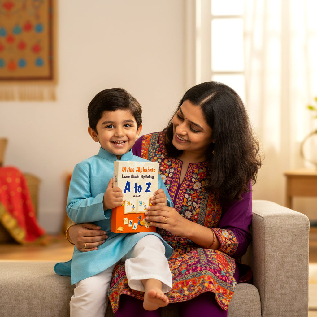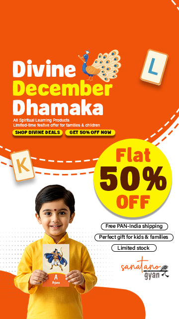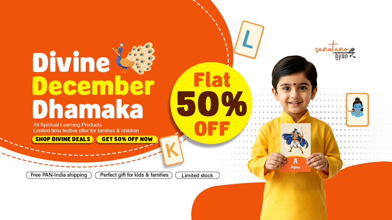 Divine Alphabet Cards are beautifully designed flashcards that teach children the English alphabet through the lens of Sanatan Dharma. Each card connects a letter to a divine character, story, or value like A for Arjuna, K for Krishna, R for Rama blending learning with culture.